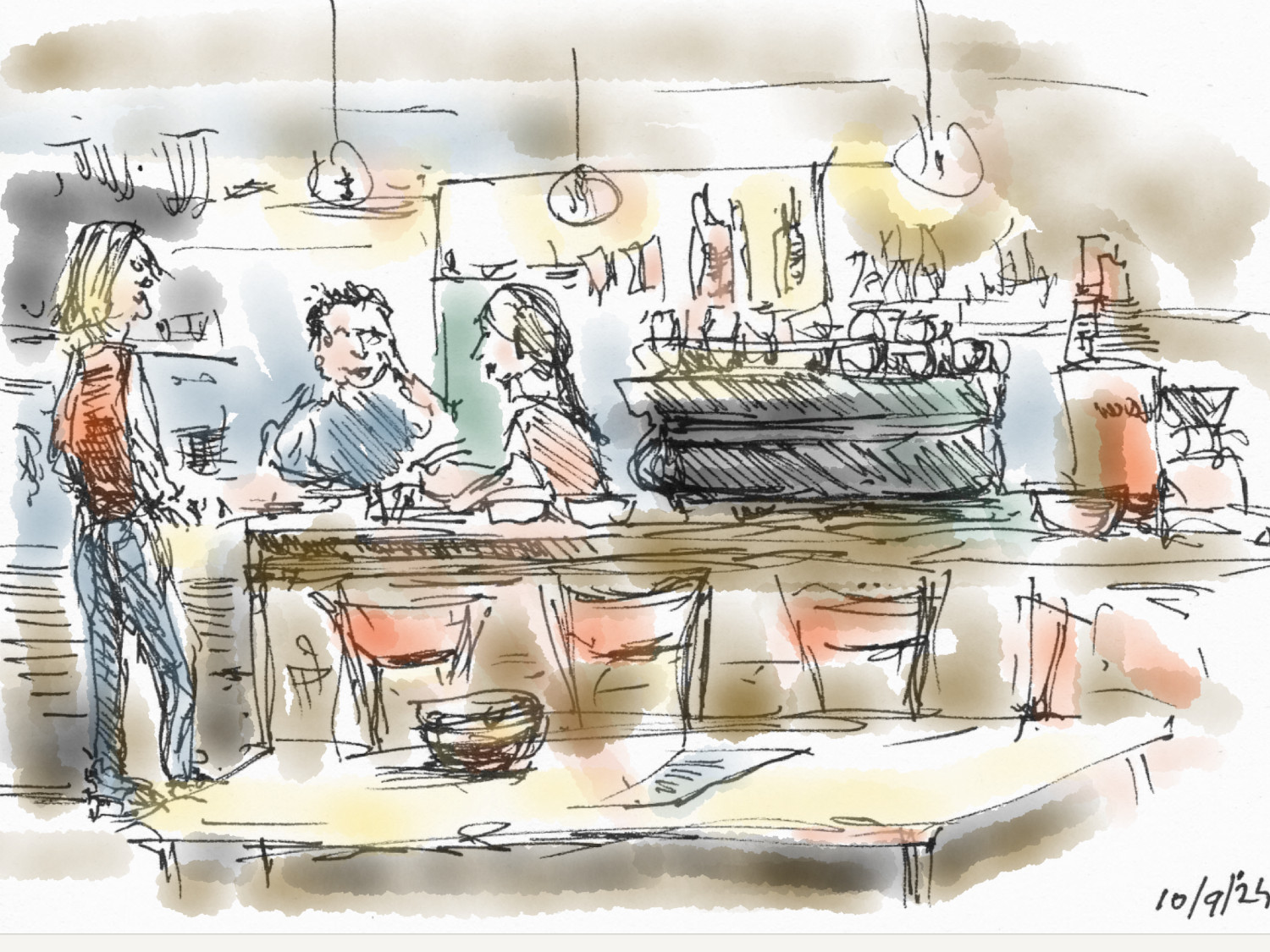 Viena Konditorei Tijdens het tekenen begon het te regenen, daarom maar even geschuild onder de luifel van de Viena Konditorei op de Plaats. Gerelateerd
