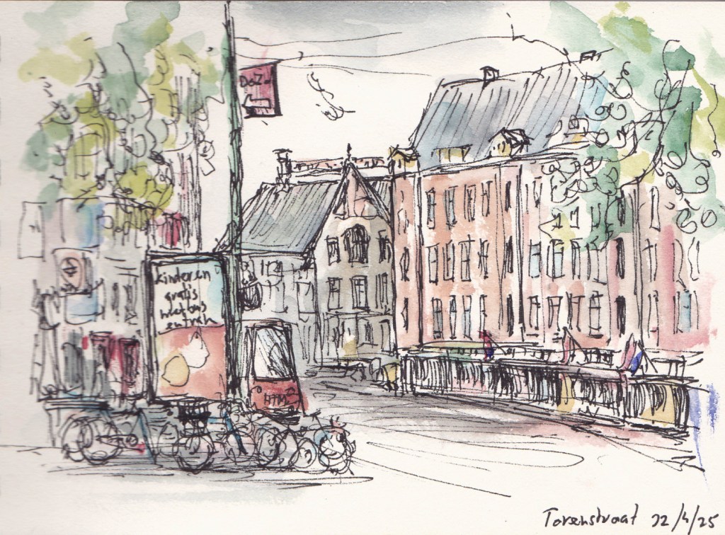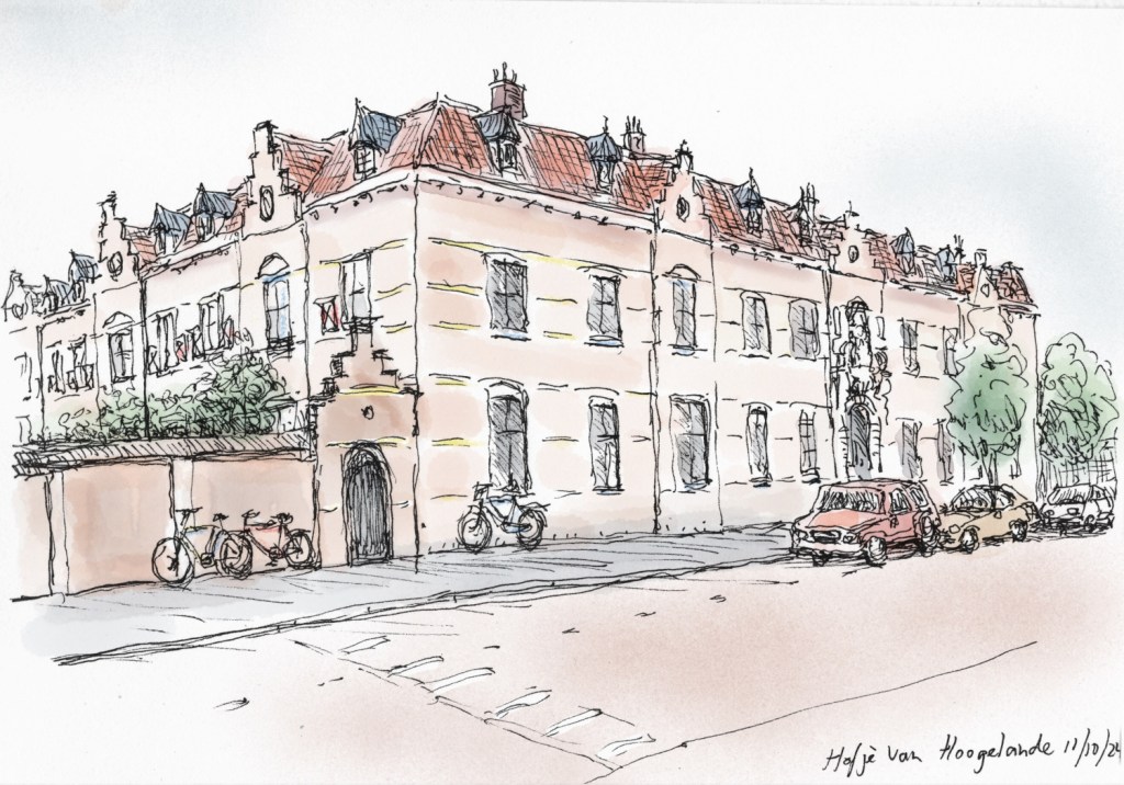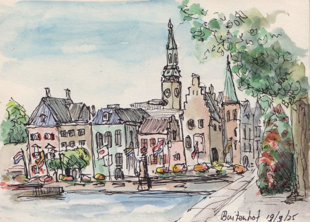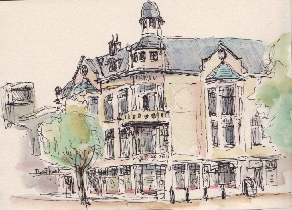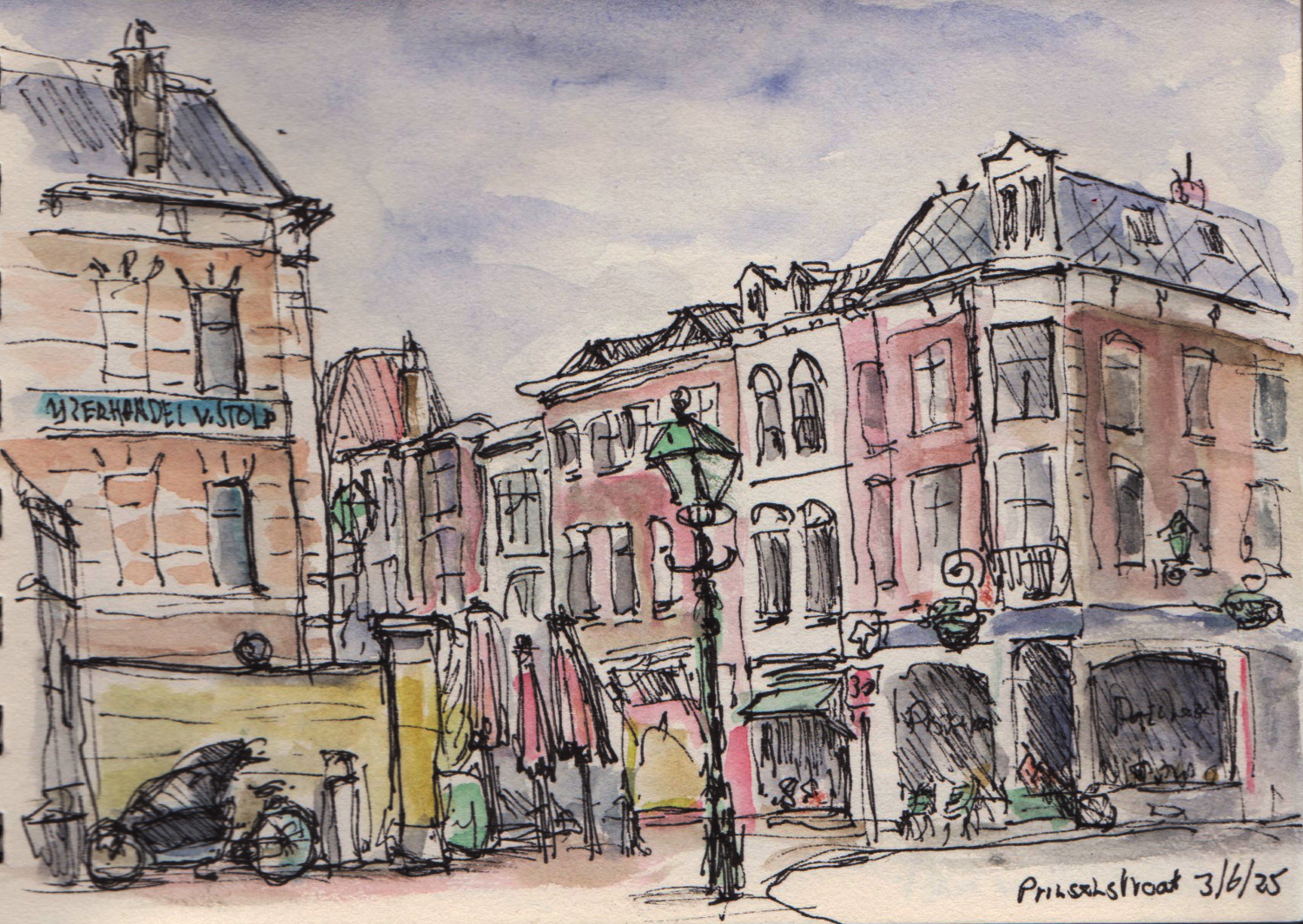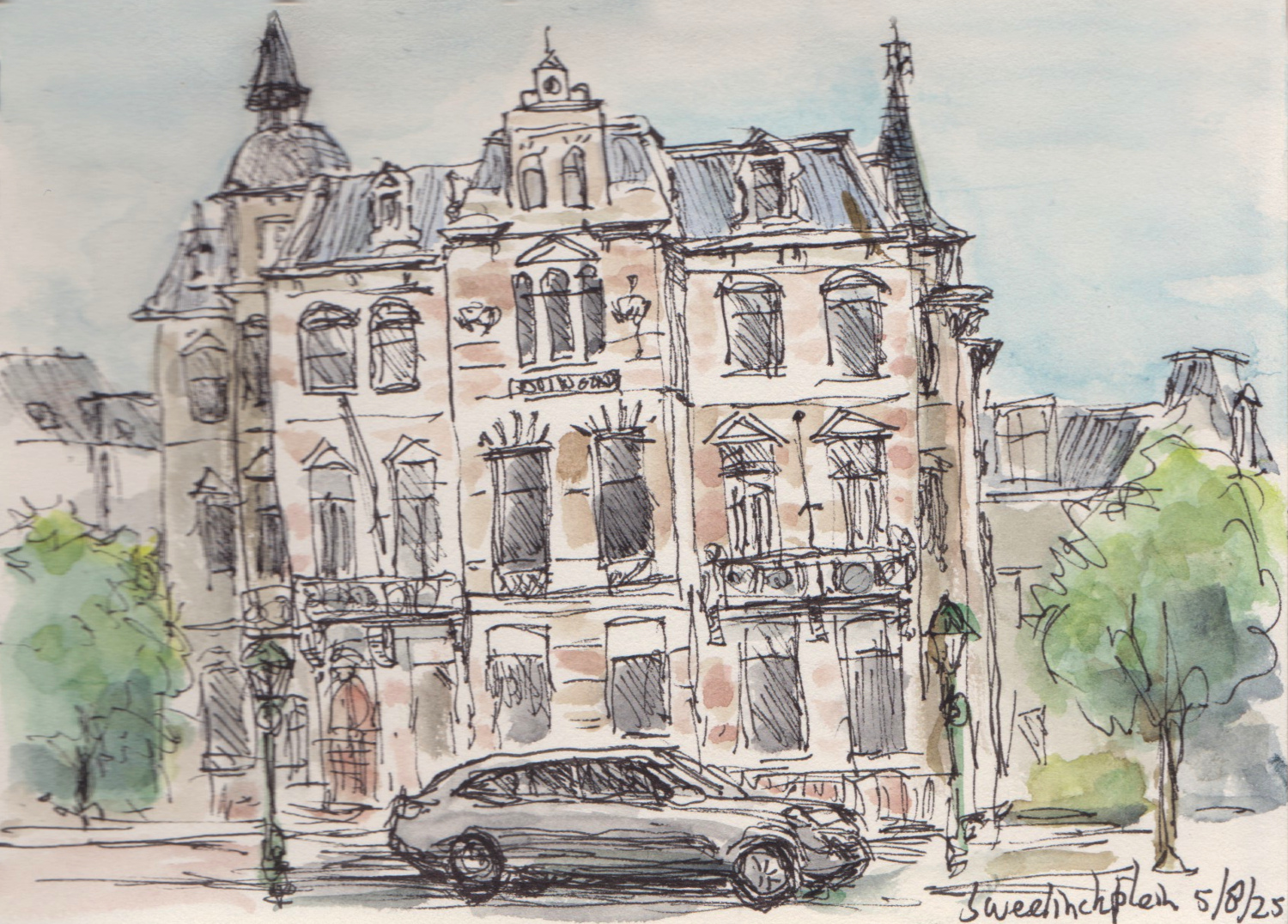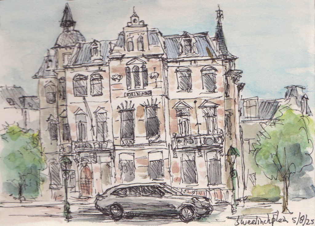 pen en aquarel Met onderstaande serie tekeningen ben ik in 2024 begonnen. Met een groepje tekenvrienden zijn we iedere dinsdagochtend op een andere locatie in Den Haag gaan tekenen.