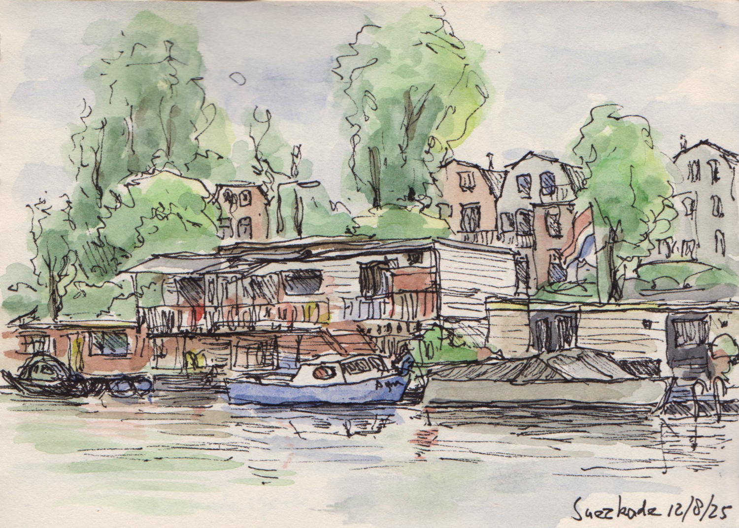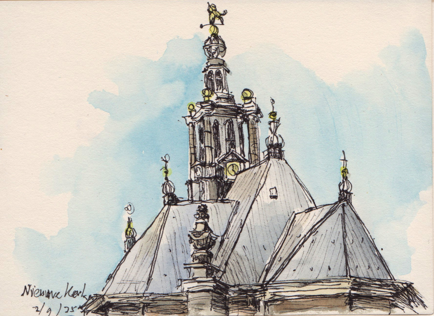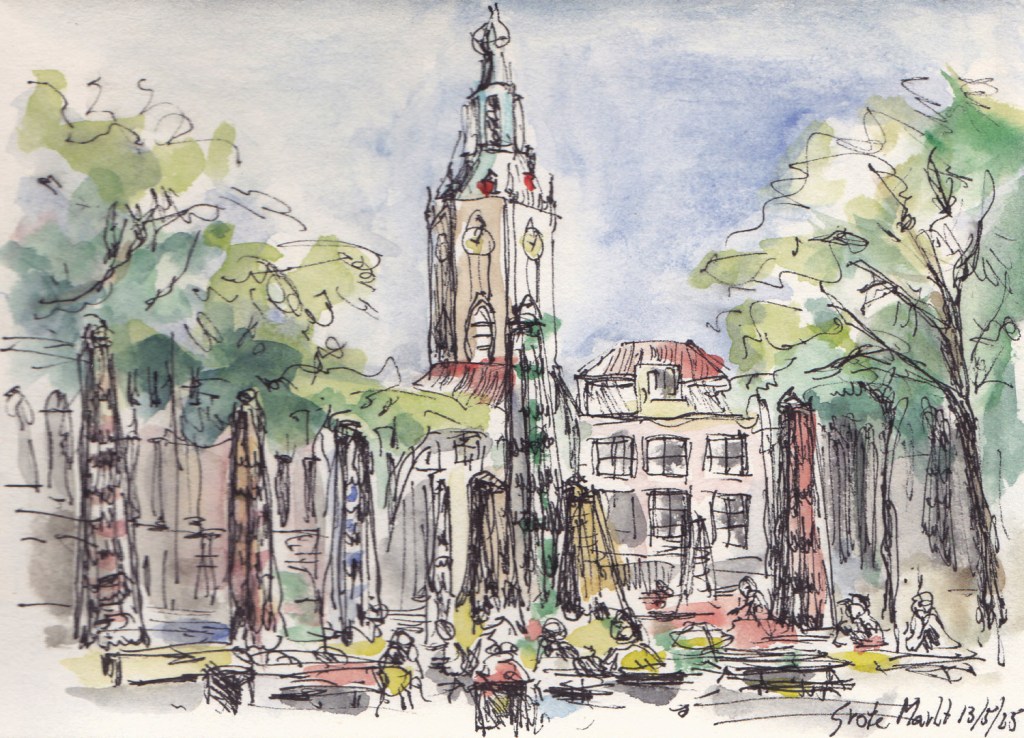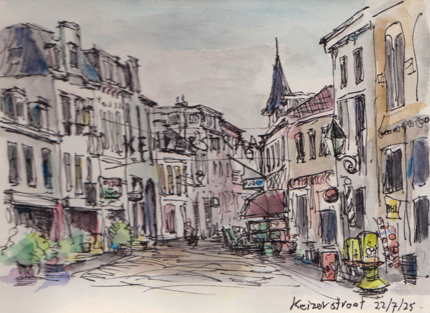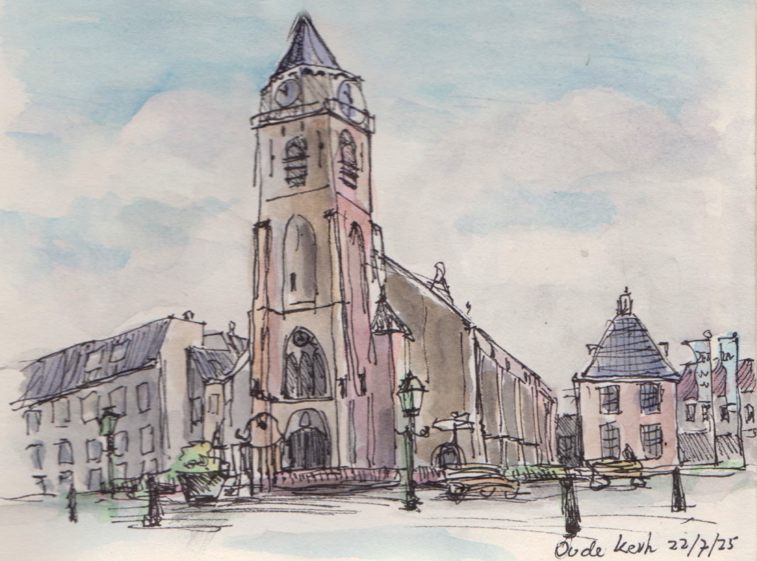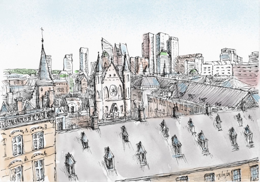 pen en aquarel Met onderstaande serie tekeningen ben ik in 2024 begonnen. Met een groepje tekenvrienden zijn we iedere dinsdagochtend op een andere locatie in Den Haag gaan tekenen.
