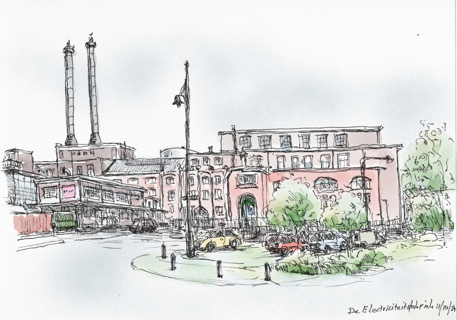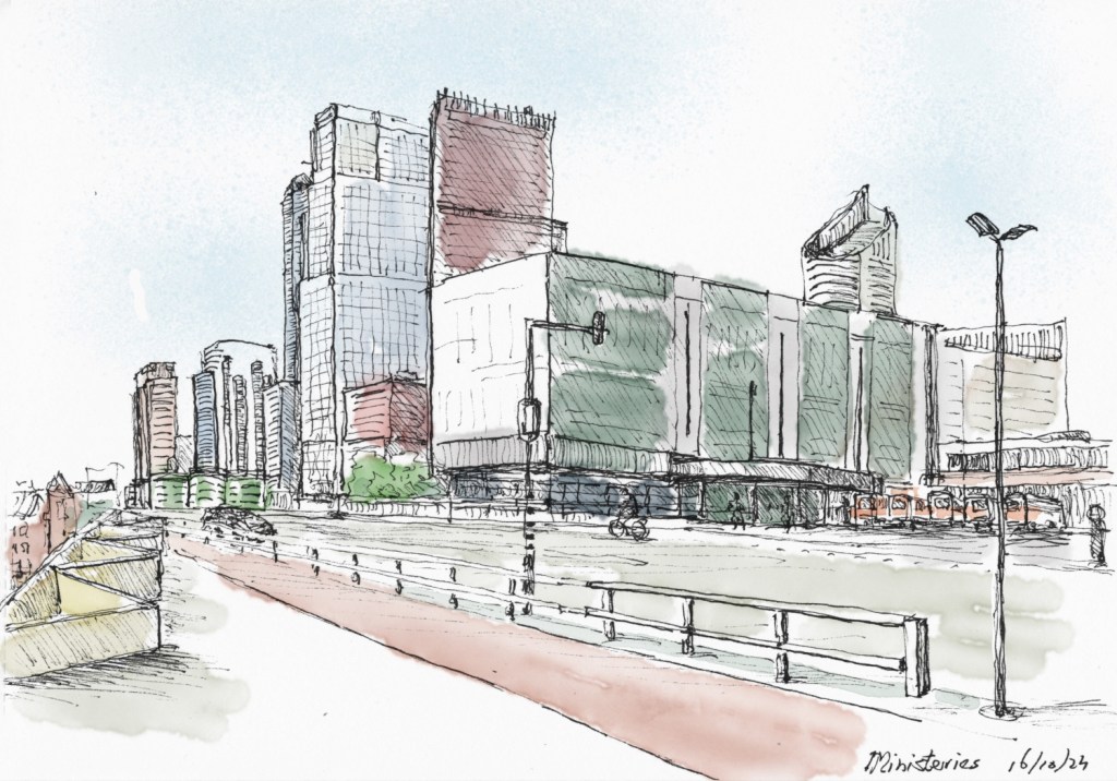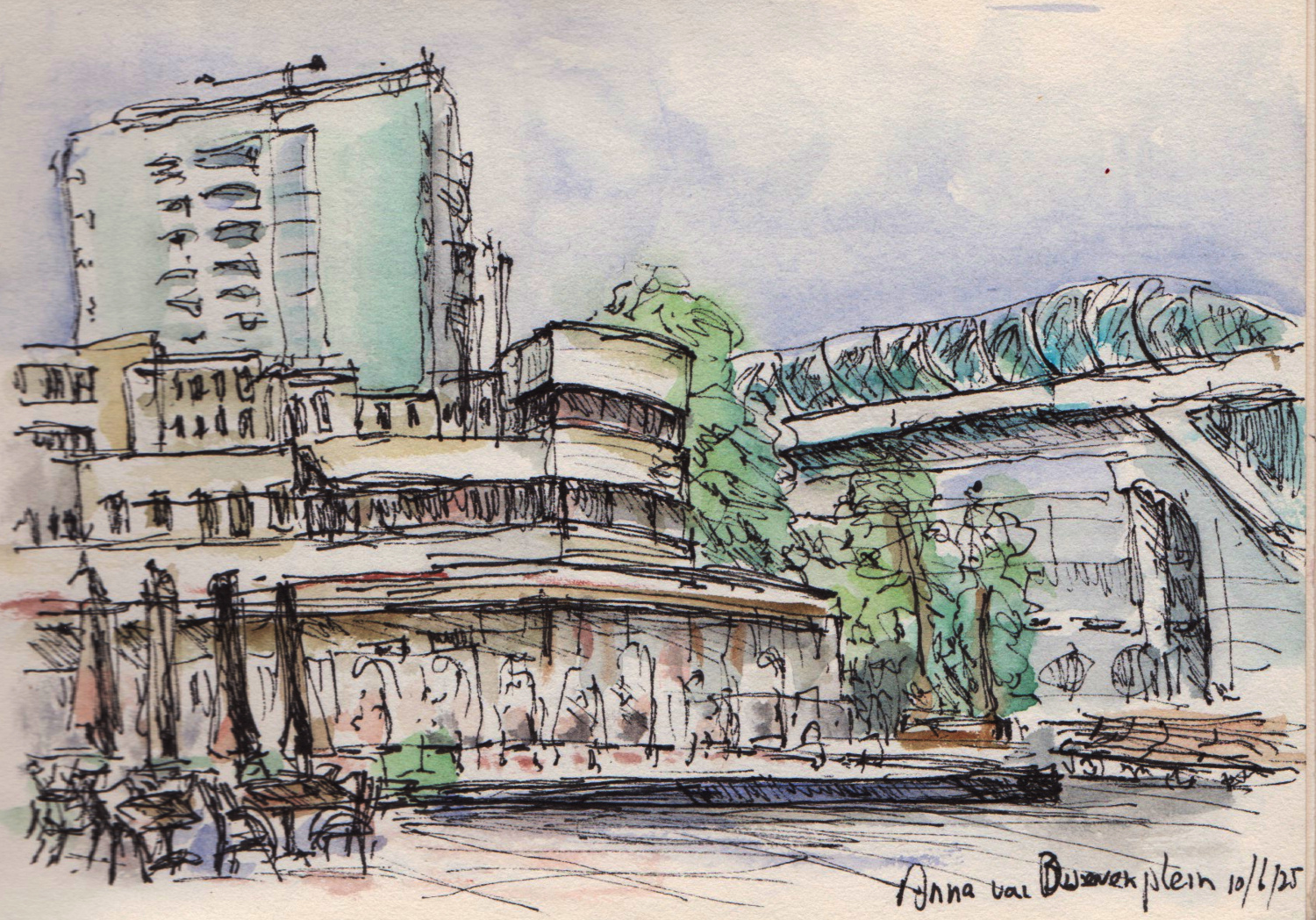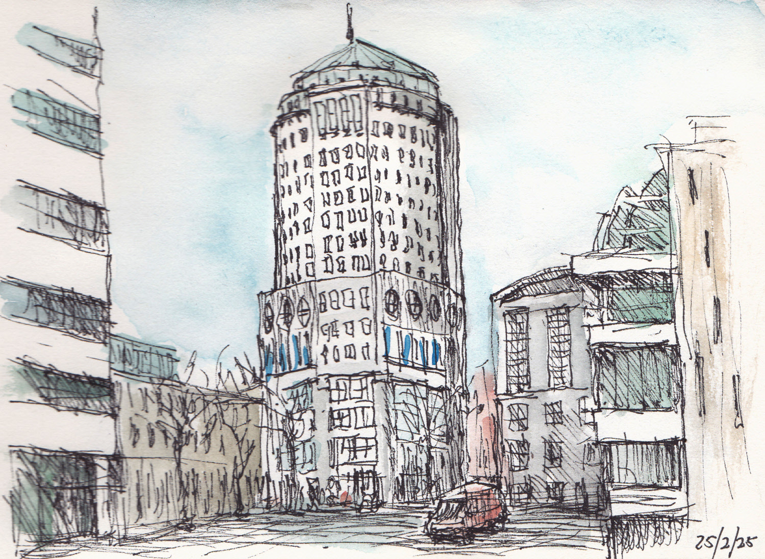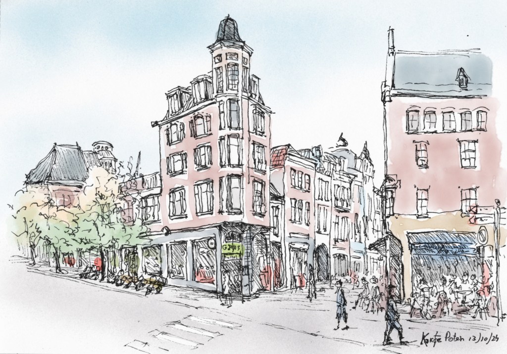 pen en aquarel Met onderstaande serie tekeningen ben ik in 2024 begonnen. Met een groepje tekenvrienden zijn we iedere dinsdagochtend op een andere locatie in Den Haag gaan tekenen.