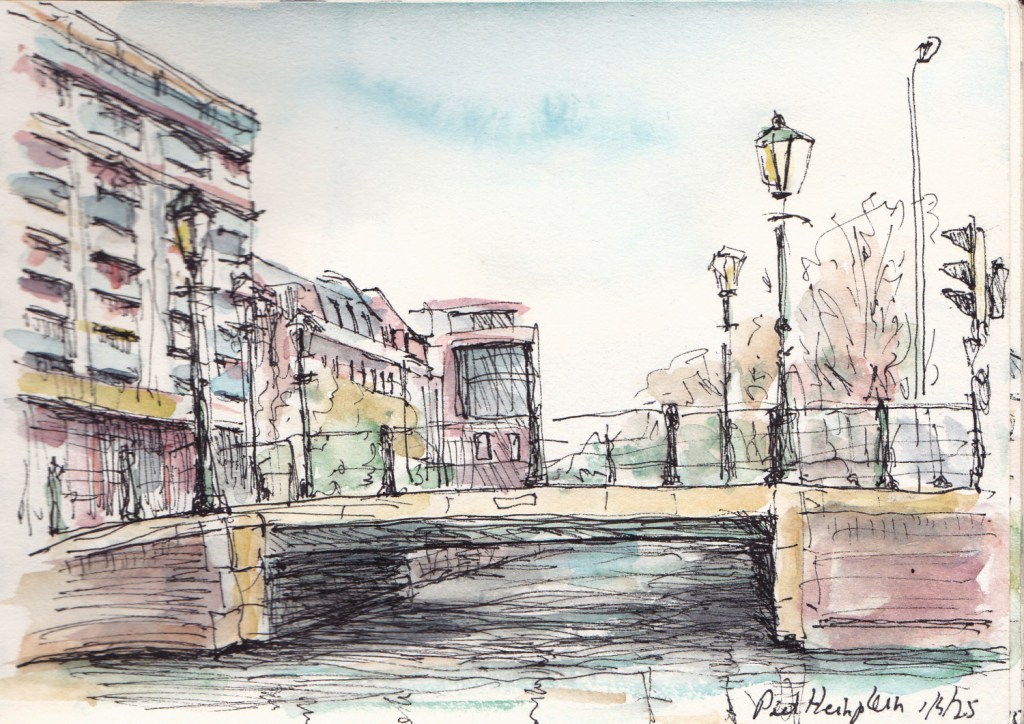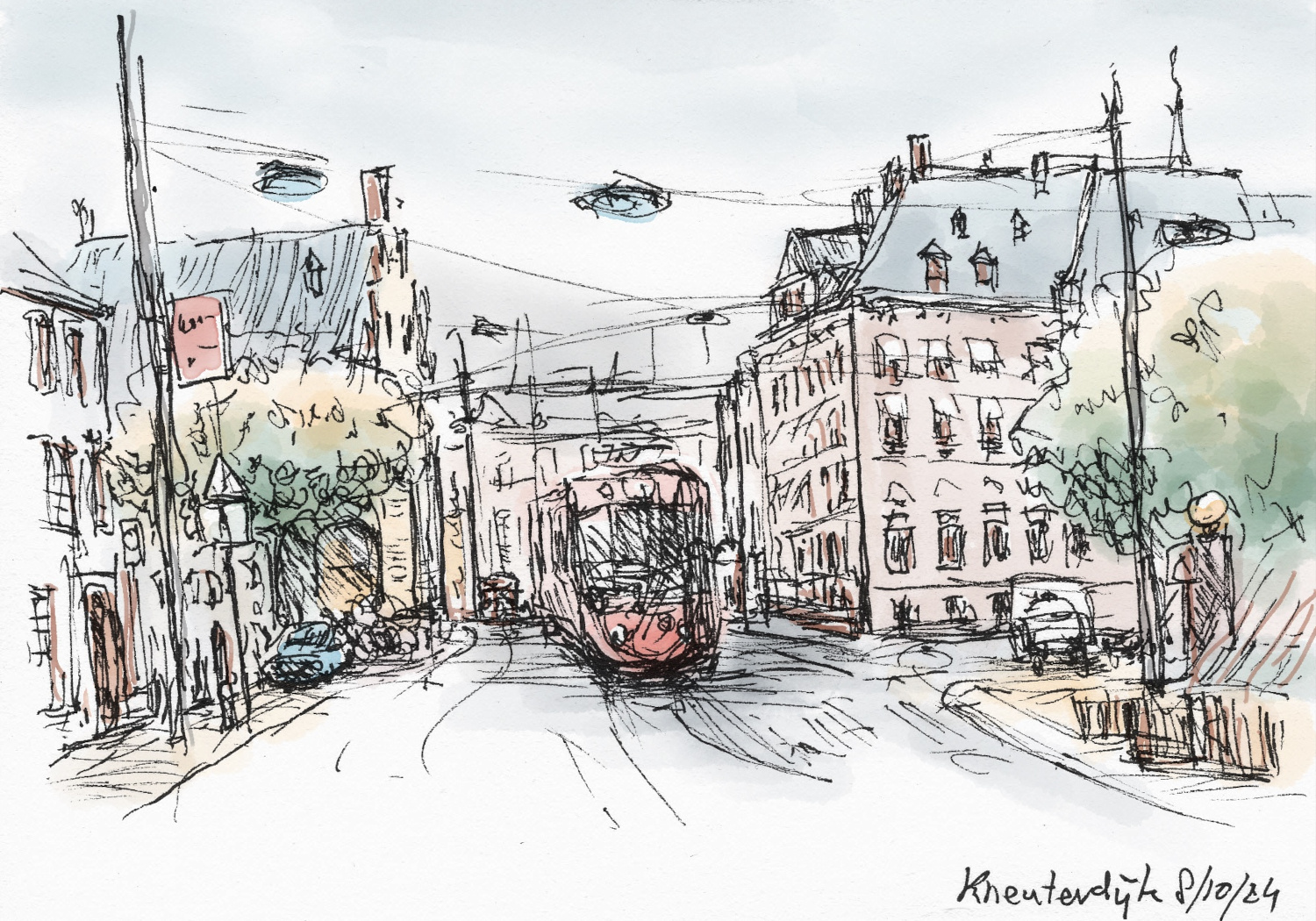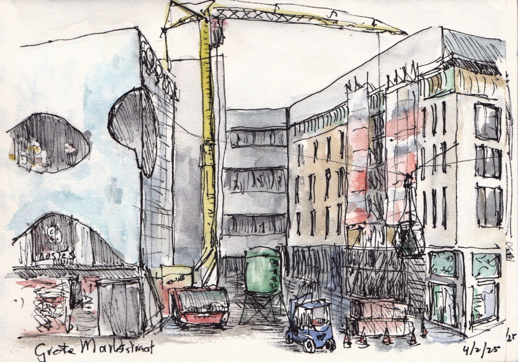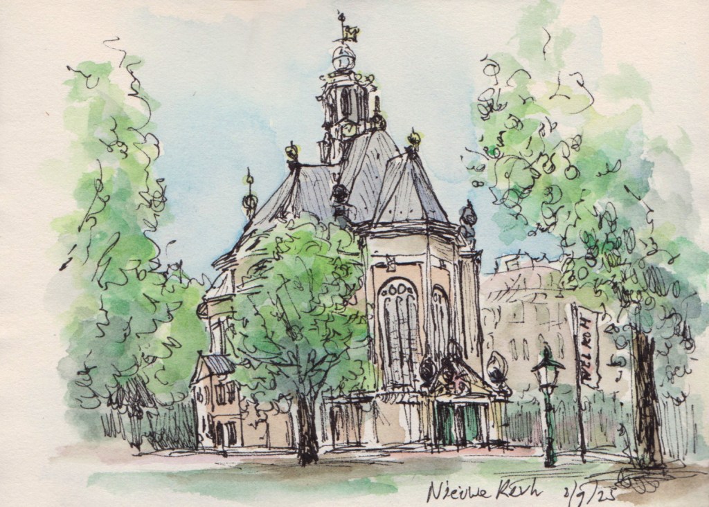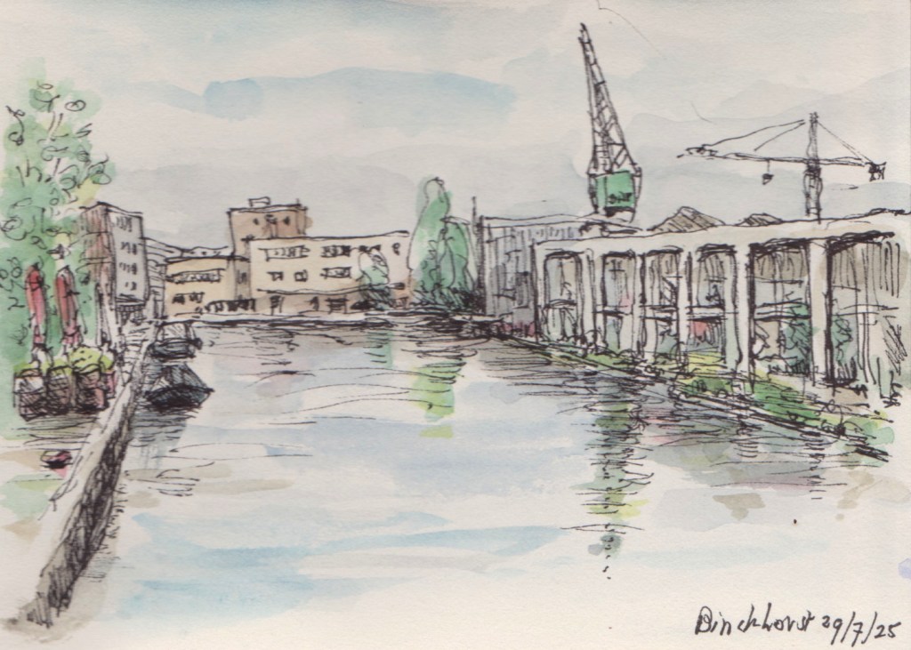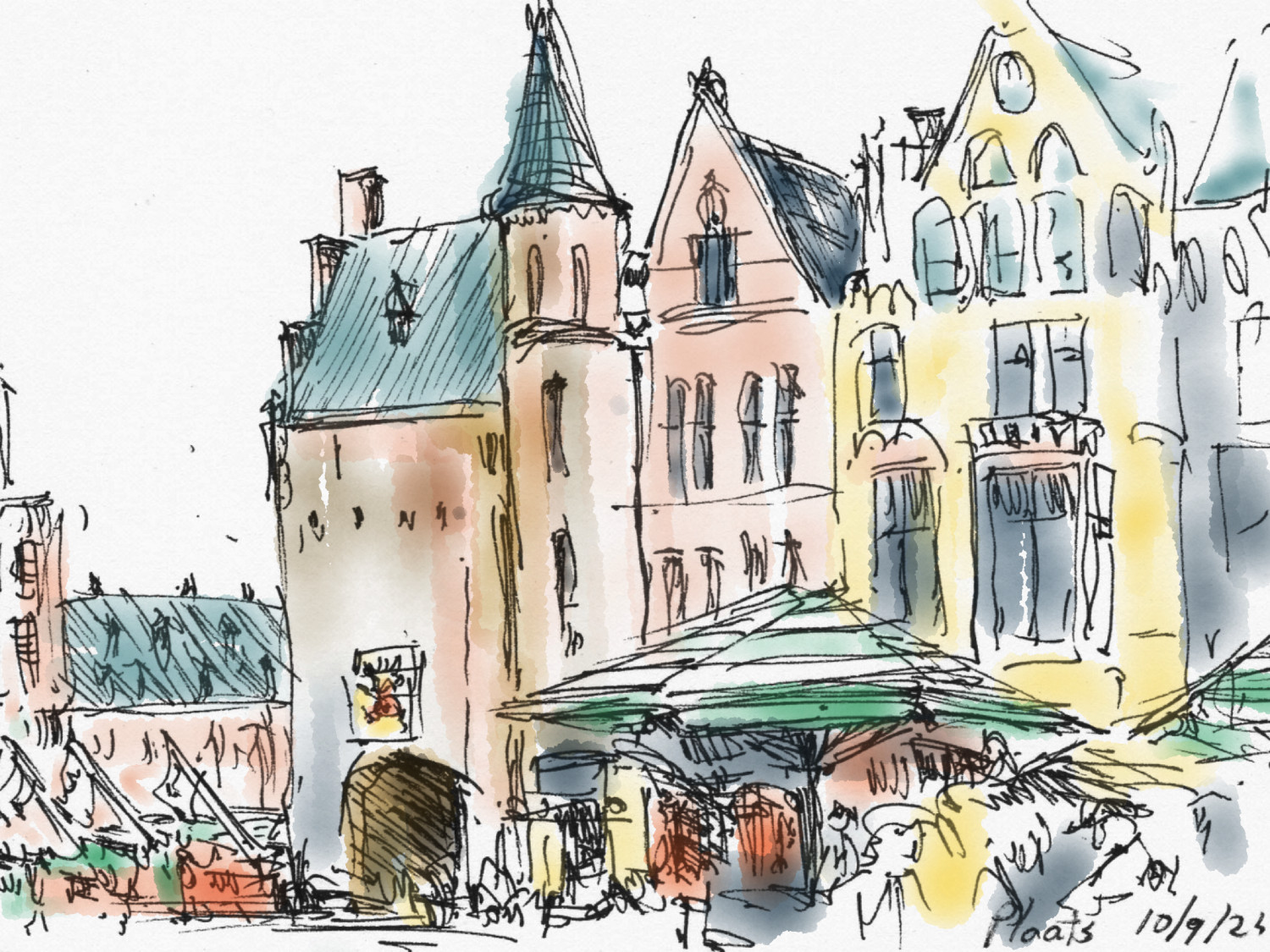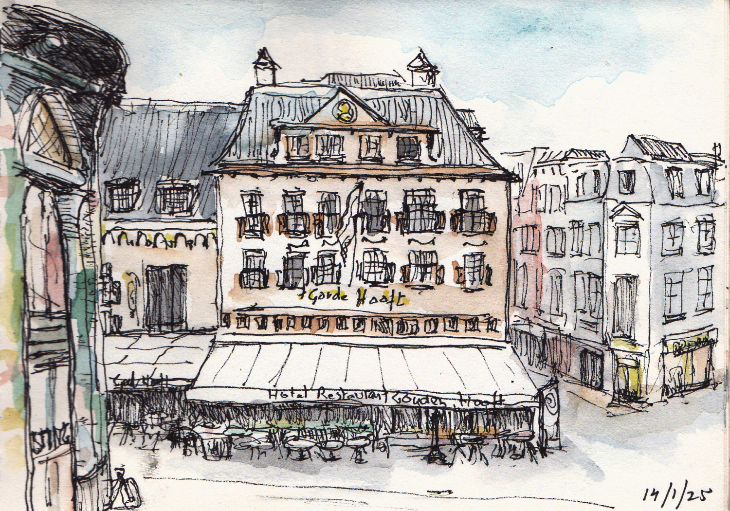 pen en aquarel Met onderstaande serie tekeningen ben ik in 2024 begonnen. Met een groepje tekenvrienden zijn we iedere dinsdagochtend op een andere locatie in Den Haag gaan tekenen.