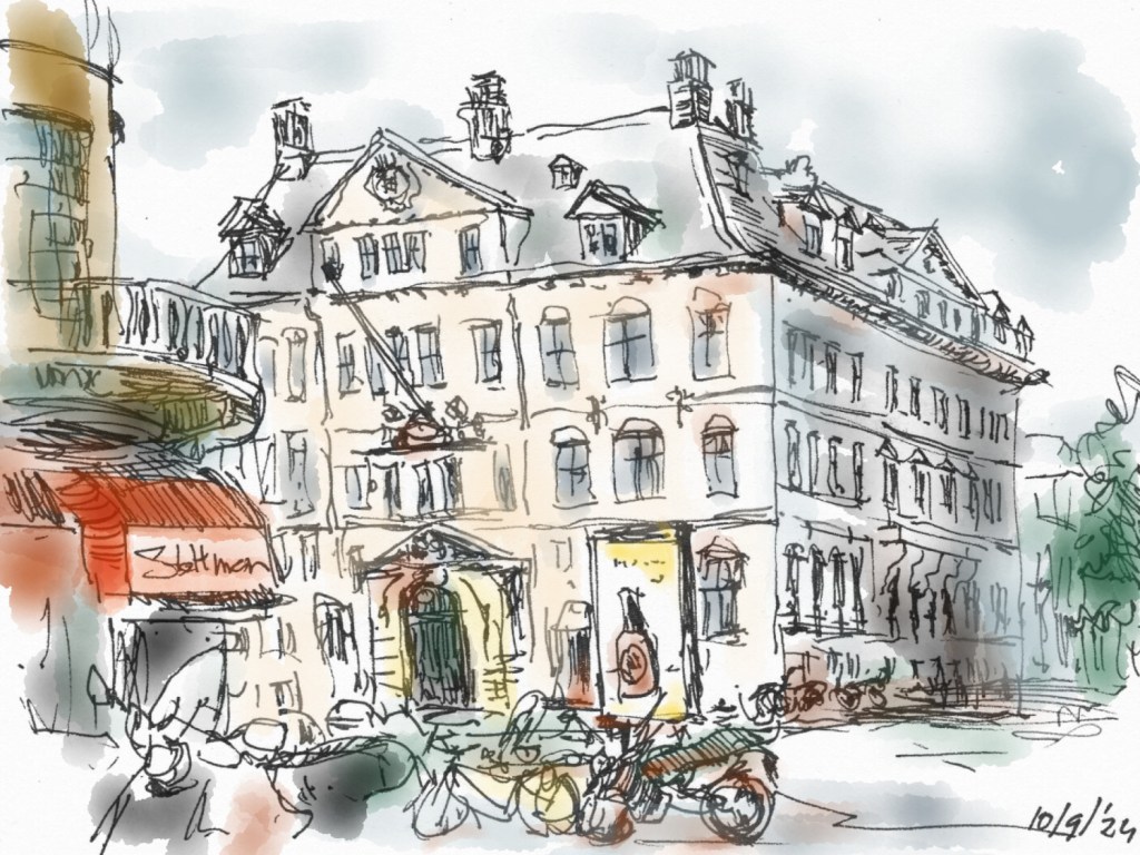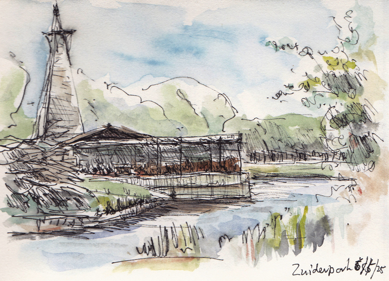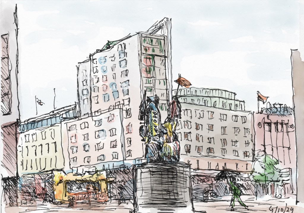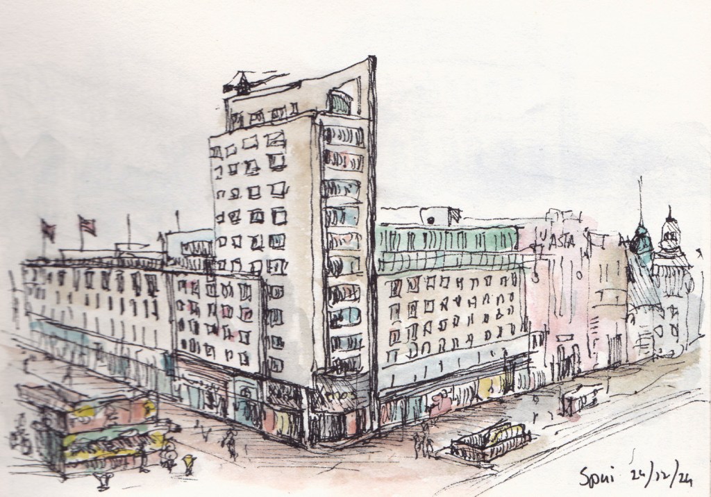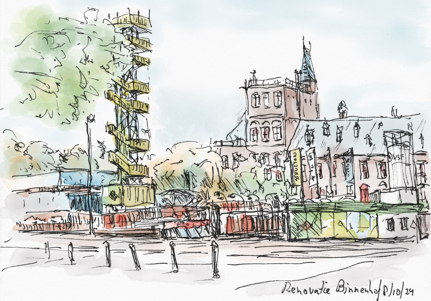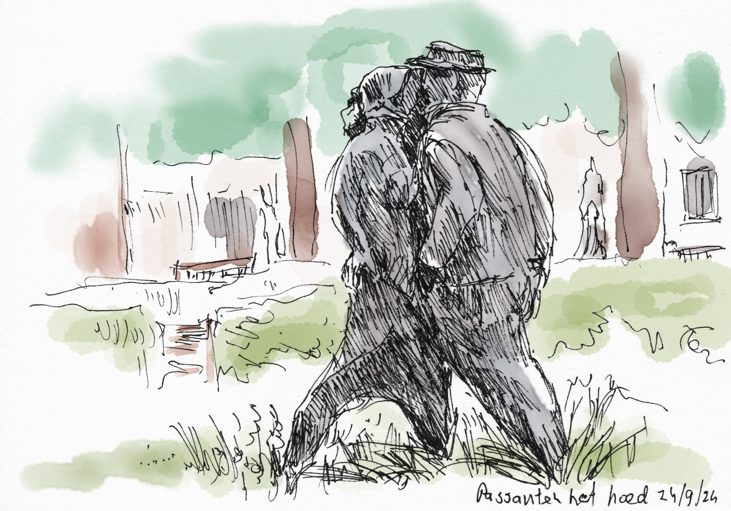 pen en aquarel Met onderstaande serie tekeningen ben ik in 2024 begonnen. Met een groepje tekenvrienden zijn we iedere dinsdagochtend op een andere locatie in Den Haag gaan tekenen.