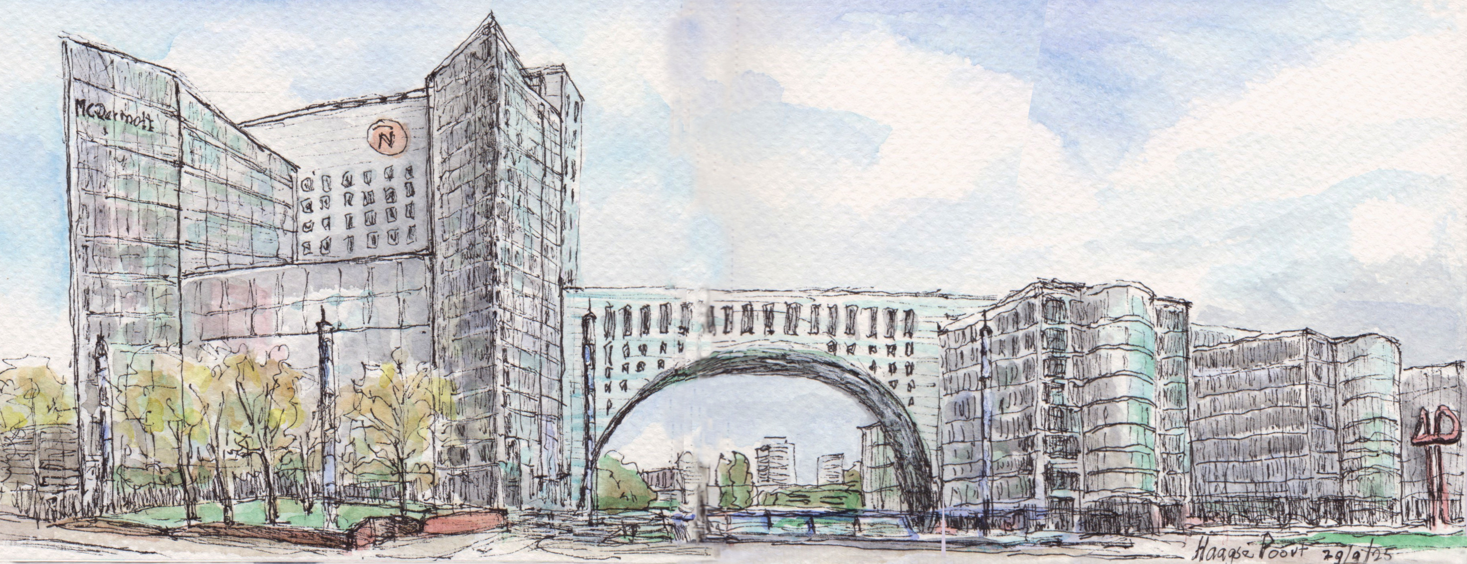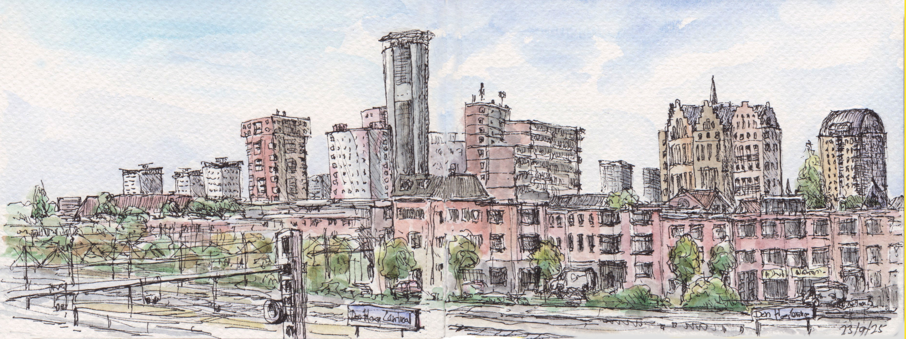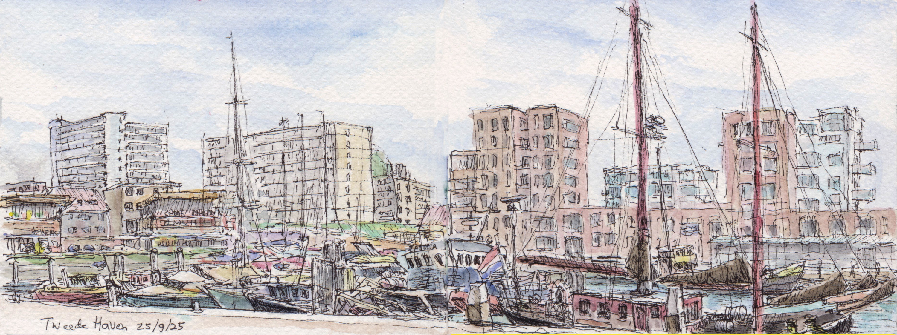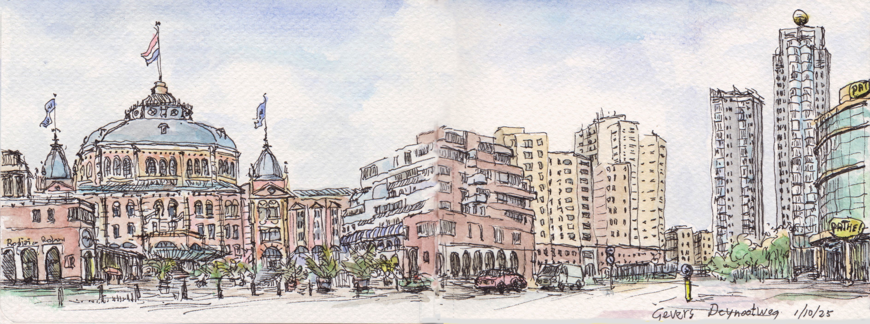 Panorama’s Onderstaande tekeningen zijn in het najaar van 2025 gemaakt in een aquarel-schetsboek op twee openslaande pagina’s van 16×12 cm, waardoor een echt ‘landscape’ formaat ontstaat.