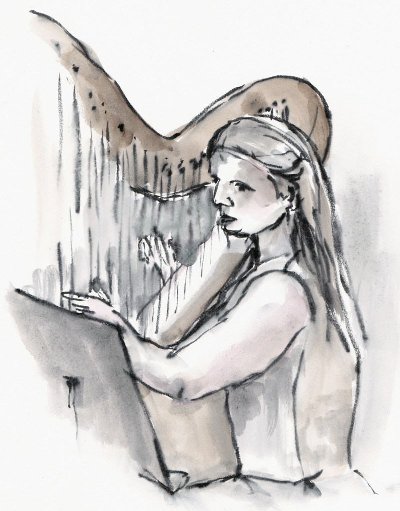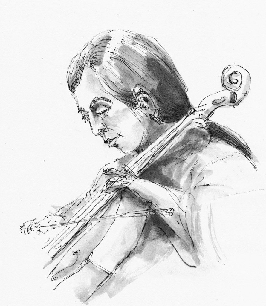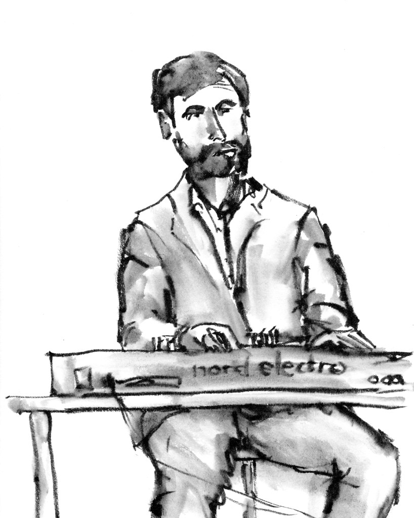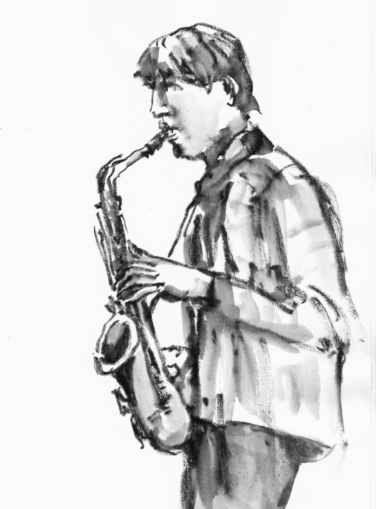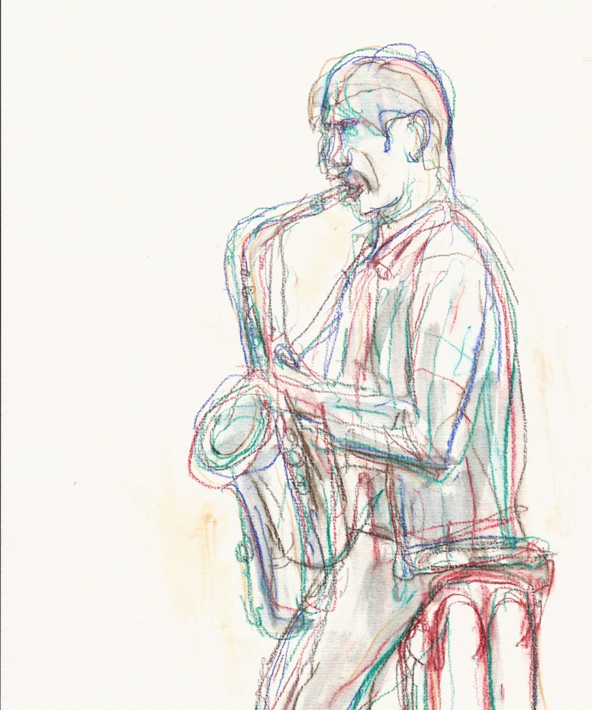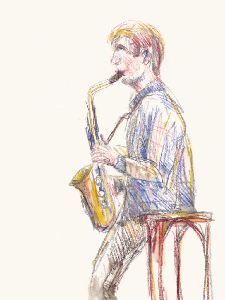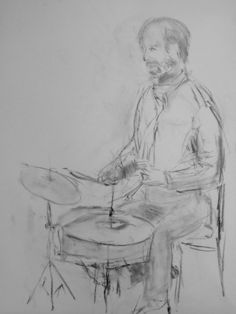 Regelmatig komt er een muzikant van het conservatorium als model. Die kan dan vrijuit spelen, ze houden geen vaste poses aan. Tekenen met live-muziek verhoogt de sfeer.