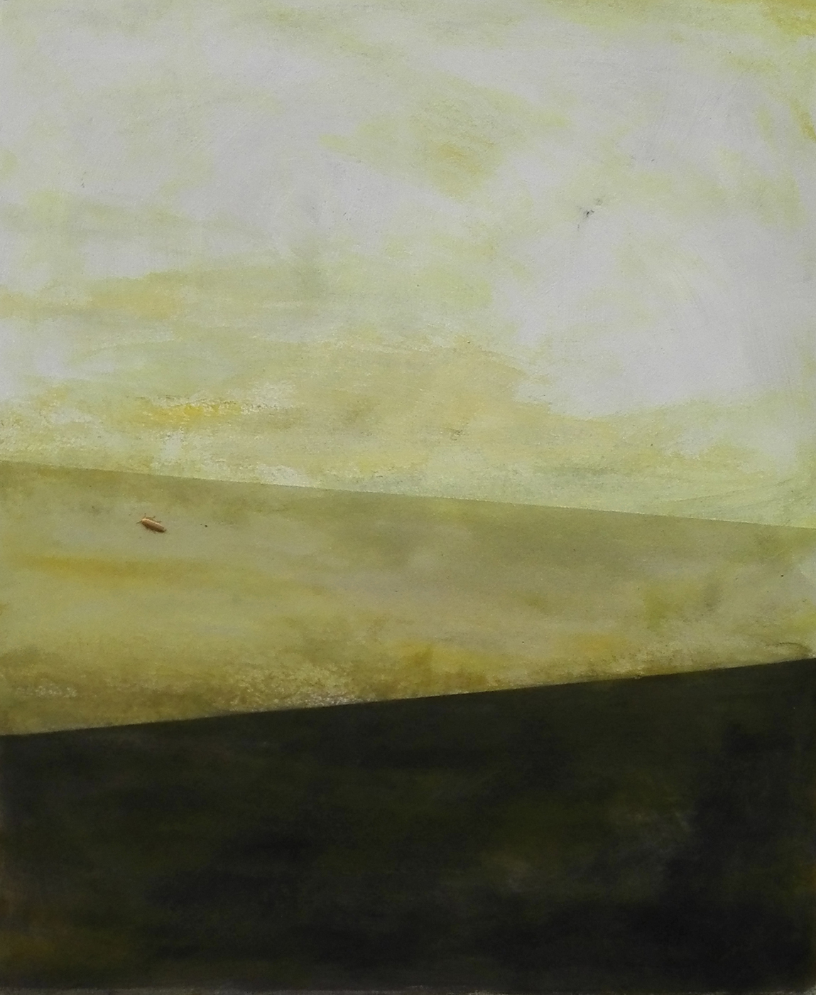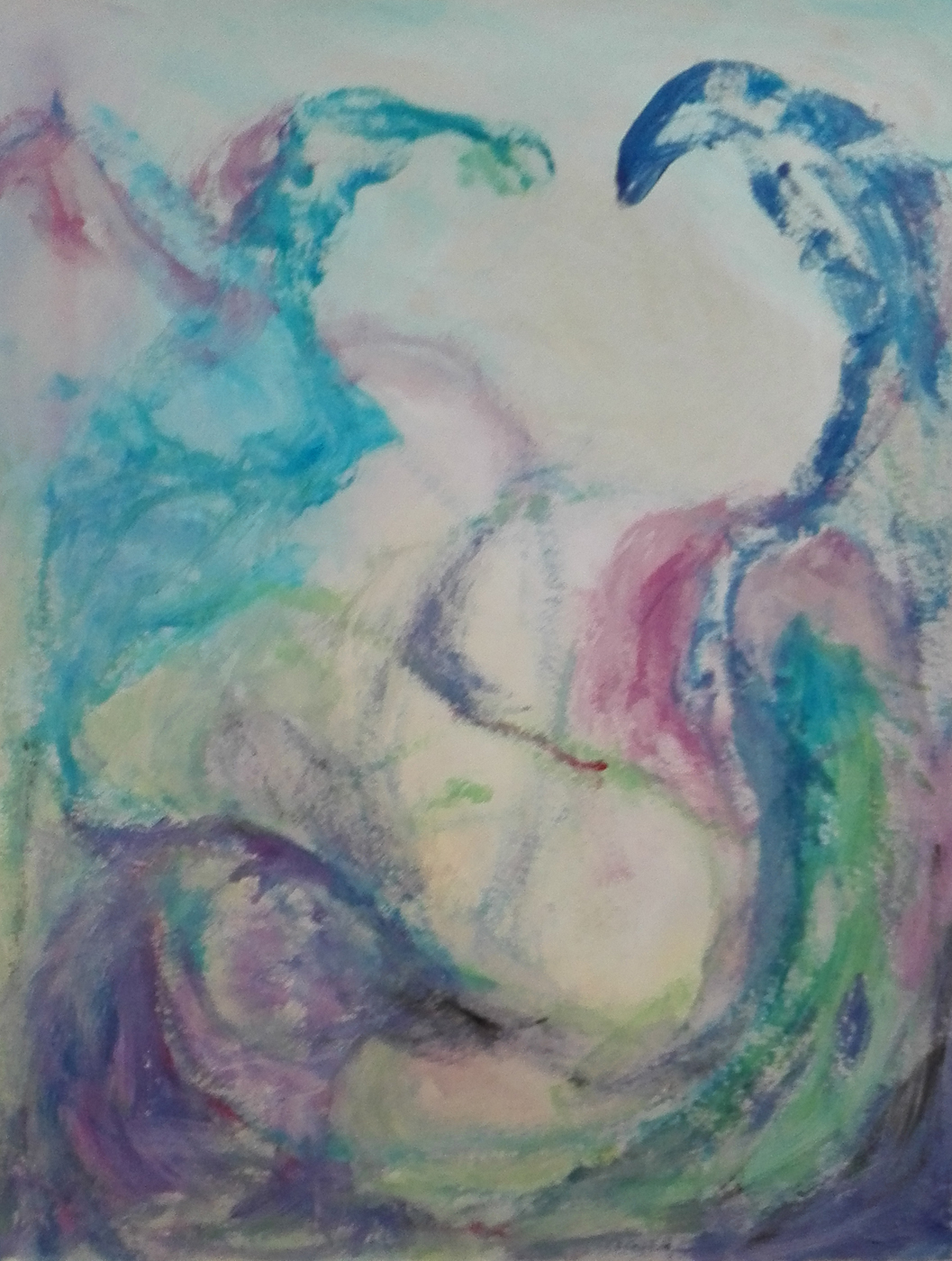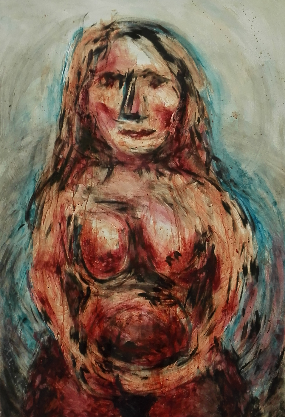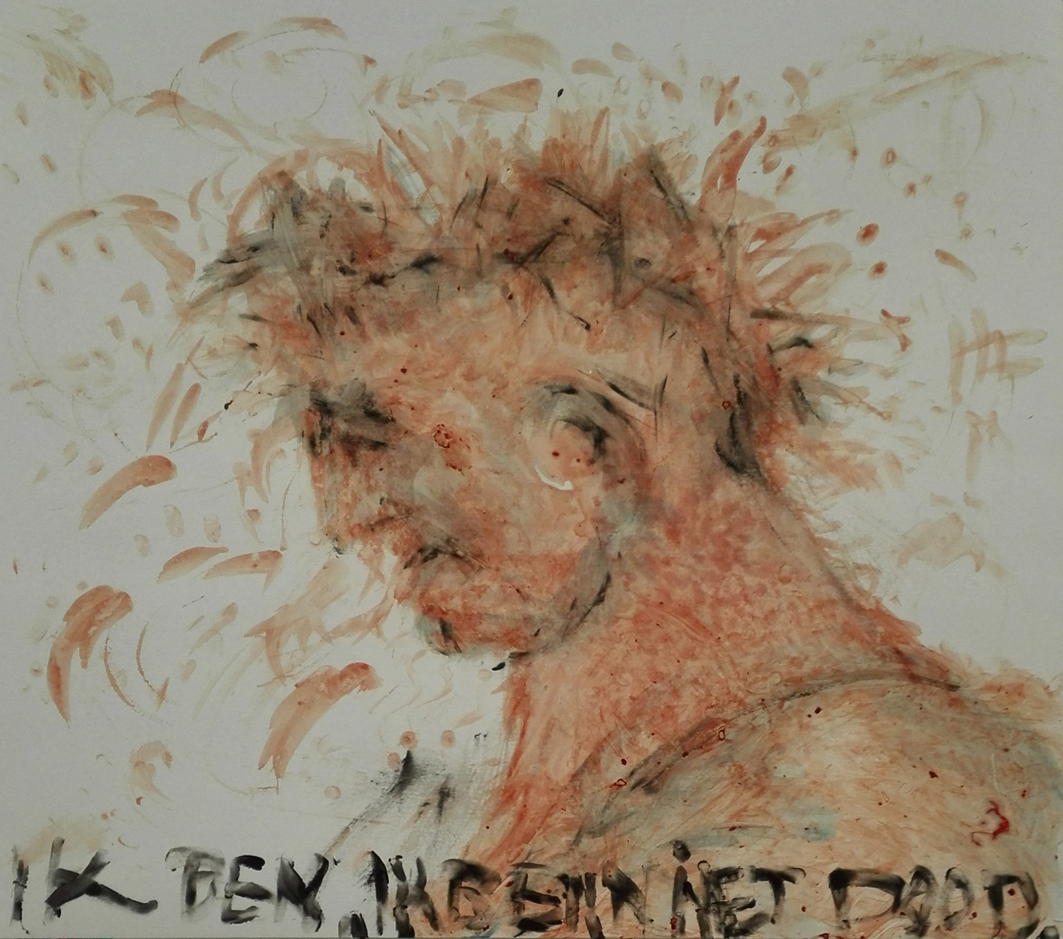 Bij Buitenkunst moesten we op zoek naar de duistere paden van de kunstgeschiedenis: schilderen met kippenlevers en bloed. Dat riep de nodige weerstand in mij op. Ik ben het experiment aangegaan, maar het is niet voor herhaling vatbaar. Al was het resultaat verrassend. Zonder voorbedachte rade ontstond dit beeld nadat ik een kippenlever en wat bloed in het midden van het vel had gedropt; mijn ‘inktpot’.